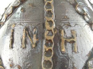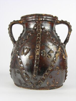 Rötlicher Scherben, innen ist er hellbraun, außen dunkelbraun engobiert und glasiert. Die Standfläche ist abgesetzt, er hat eine weite Öffnung, eine profilierte Kragenlippe und zwei gegenständige, profilierte Bandhenkel die in der Lippe enden. Quer über das Gefäß laufen, sich kreuzende Zierbänder. Inschrift: Datum "1786", Initialen INH.