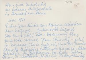 Schwarzweißfotografie. Dieses Klassenfoto, aufgenommen im Jahre 1921, zeigt die Ober- und Untertertia der ehemaligen Höheren Bürgerschule an der Engerser Straße Ecke Ringstraße in Bendorf. Ganz links außen hinter dem kleinen Mädchen steht Hans Wiegand. Unten rechts liegend ist Otto-Ernst Feld (Firma Feld & Vorstmann) und oben ganz rechts stehend Hans Okunski zu erkennen. 1872 kam es auf Initiative von Franz W. Remy zur Gründung der Höheren Bürgerschule. Zweck der Schule war neben der auf der Elementarschule aufbauenden Weiterbildung die Vorbereitung der Schüler auf höhere Lehranstalten (Gymnasium, Real- oder Gewerbeschule). Jungen und Mädchen hatten Zugang zu der Höheren Bürgerschule unabhängig welcher Konfession sie angehörten. Die Unterhaltung der Schule wurde durch die Einnahme von Schulgeldern und Ergänzungsbeiträgen von Förderern finanziert. Ein Kuratorium unter dem Vorsitz von Franz Remy regelte die Finanzen und die Anstellung der Lehrer. Am 28.06.1877 wurde der Grundstein zum Bau des neuen Schulhauses gelegt. Am 14.10.1878 war der Neubau bezugsfertig und rund 80 Schüler und Schülerinnen begannen dort mit ihrer schulischen Ausbildung. Die Bausumme von 48.000 DM stiftete zum größten Teil die Bendorfer Unternehmerfamilie Remy. Aufgrund finanzieller Schwierigkeiten kam es 1899 zur Schenkung der Schule und des Grundstücks an die Gemeinde. Die Einbrüche in der Wirtschaft in den 1920er Jahren führten schließlich zur Schließung der Schule am 1. April 1931.