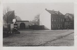 Schwarzweißfotografie. Dieses Bild entstand in den 1930er Jahren und zeigt die ehemalige evangelische Schule aufgenommen vom Gemeindegarten aus. Bei dem Gebäude am rechten Bildrand handelt es sich um den ehemaligen, im 18. Jahrhundert erbauten, spätmittelalterlichen "Freiadligen Hof", der bis 1880 als Bürgermeisterei und im Anschluss zu Schulzwecken genutzt wurde. Das Gebäude wurde 1954 abgerissen und an dieser Stelle wurde das katholische Pfarrhaus erbaut.