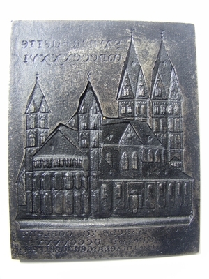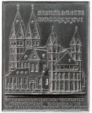 Eisenguss. Sayner Neujahrsplakette von 1836 die eine Ansicht St. Kastorkirche in Koblenz zeigt. Die Entwurfszeichnung stammt von Georg Osterwald und das Modell von Carl Christian Cramer. Oben rechts lautet die Beschriftung auf der Vorderseite "SAYNERHUETTE MDCCCXXXVI" und unten am Rand "CASTORKIRCHE ZU COBLENZ / EINGEWEIHT DCCCXXXVI / ZUR TAUSENDJÄHRIGEN JUBELFEIER". Anlässlich des Neujahrs 1836 brachte die Sayner Hütte eine Plakette heraus mit dem Motiv der St. Kastorkirche in Koblenz. Anlass war das 1000-jährige Jubiläum der ehemaligen Stiftskirche St. Kastor, die hier in einer Ansicht von Südosten zu sehen ist. Es handelt sich um eine dreischiffige Emporenbasilika mit Querhaus, Chor- und Doppelturmfassade erbaut auf den Fundamenten einer karolingerzeitlichen Kirche. Kaiser Ludwig der Fromme hatte maßgeblich Anteil an der Gründung von Kirche und Stift im Jahre 836. Zur Weihe ließ Erzbischof Hetti von Trier den größeren Teil der Gebeine des Heiligen Kastor aus Karden überführen. Die Stiftskirche diente zeitweise als Grablege der Trierer Erzbischöfe, wie u.a. das Grabmal Kuno´s von Falkenstein bezeugt, wodurch ihr eine besondere Bedeutung zukam. Entwurf: Georg Osterwald; Modell: Karl Christian Kramer; Wie in Berlin wurden auch in Sayn, auf Anregung der Oberberghauptmannschaft, ab 1819 bis 1865 jeweils zum neuen Jahr Reliefplaketten in seidengefütterten roten Lederetuis mit beigefügtem Erklärungstext an Beamte, Geschäftsfreunde und Kunden mit Glückwünschen und Empfehlungen versandt. Man nannte diese Plaketten „Neujahrskarten“. Während die Berliner und die Gleiwitzer Gießerei herausragende Güsse des vergangenen Jahres abbildete, wählte die Sayner Hütte mit Ausnahme der ersten und der dritten Neujahrsplakette als Motiv ein Bau- oder Kunstdenkmal des Rheinlandes oder Westfalens. Während man anfangs noch einige Denkmäler der Antike als Relief für die Neujahrsplaketten umsetzte (Neujahrsplaketten der Jahre 1822, 1824, 1833), verlagerte sich schließlich der Schwerpunkt der in Eisen gegossenen Motive auf das im Zuge der („Rhein“-) Romantik immer mehr in den Mittelpunkt des Interesses gerückte Mittelalter. Einerseits bildeten die Neujahrsplaketten berühmte Kirchenbauten des Mittelalters, wie beispielsweise die romanischen Kirchen St. Aposteln, St. Gereon und St. Kunibert in Köln, andererseits im neugotischen Stil neu erbaute (St. Apollinaris) bzw. wiederaufgebaute (Königsstuhl in Rhens) oder sogar weitergebaute (Kölner Dom) Baudenkmäler ab.