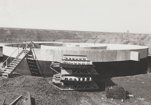 Schwarzweißfotografie. Dieses Foto vom 23. Mai 1979, zeigt Arbeiten im Rahmen der Baumaßnahme Klärwerk Bendorf in der Langfuhr. Diese Aufnahme zeigt das aus wasserdichtem Stahlbeton gebaute Belebtschlammbecken mit einem Durchmesser von 30 Metern bei einem Fassungsvolumen von 1.600 Kubikmetern. In diesem Becken geschieht die biologische Reinigung des Abwassers mit Hilfe von Sauerstoff und Bakterien. Beginn dieses Bauprojektes war im September des Jahres 1978, die Bauzeit betrug etwa 3 Jahre bei einem Kostenpunkt von etwa 7 Millionen DM.