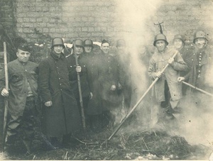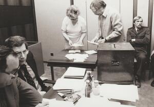 Schwarzweißfotografie. Diese Aufnahme vom 08. August 1981, zeigt u.a. den damaligen Ersten Beigeordneten der Stadt Bendorf Gerd Saxer (2. v.l.), Andreas Damian von der SPD Bendorf (3. v. l.) und Hajo Stuhlträger von der CDU Bendorf (2. v. l.9gemeinsam mit allen Gewinnern der Bendorfer Stadtmeisterschaften im Fußball.
