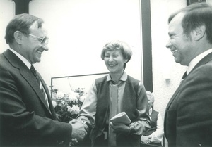 Schwarzweißfotografie. Dieses Foto, aufgenommen am 30. Oktober 1979, zeigt den neu gewählten Bürgermeister der Stadt Bendorf Dieter Trennheuser während seiner Amtseinführung. Werner Hempler (CDU) beglückwünscht Trennheuser zu seinem neuen Amt und überreicht einen Strauß Blumen. Er übernahm das Amt des Bürgermeisters von Karl Schön. Seine Amtszeit reichte bis in das Jahr 1994.