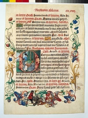 Kardinal Albrecht von Brandenburg gehörte zu den großen Auftraggebern seiner Zeit. Die von ihm veranlassten liturgischen Handschriften ließ er reich illustrieren. Das umfangreichste Miniaturenwerk, das für ihn entstand, ist das Missale Hallense, das Nikolaus Glockendon 1524 fertig stellte. Aus dieser Handschrift besitzt die Graphische Sammlung vier vollständige Seiten und mehrere herausgeschnittene Initialen. Die hier abgebildete Seite weist außer reichem floralen Rankenwerk mit Vögeln und einem Schmetterling eine O-Initiale mit dem Kardinal als hl. Ambrosius im Bischofsornat auf.