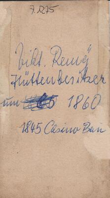 Schwarzweißfotografie, sog. Carte-de-Visite. Dieses Ganzkörper-Portrait entstand im Jahr 1860 und zeigt den Bendorfer Fabrikanten Viktor Remy. Viktor Remy (1810-1872) war der Sohn des Bendorfer Fabrikanten Wilhelm Gideon Remy und seiner Ehefrau Jeannette Remy (geb. Hoffmann). Sein Vater setzte ihn schon früh im Bendorfer Familienunternehmen ein und er blieb dort sein Leben lang als Hauptbeteiligter tätig. Im Jahre 1840 gründete er in der Ölmühle der Firma "Remy, Hoffmann & Co." mit einem Compagnon die Zichorienfabrik "Remy & Graeff", die später sein Sohn Fritz übernahm. Zusammen mit seinem Bruder Moritz und Dr. de la Vigne gründete er an der Chaussee nach Vallendar eine Bier-Brauerei (späterer Standort der Remynol-Fabrik). Viktor Remy war verheiratet mit Laura von Carnap.