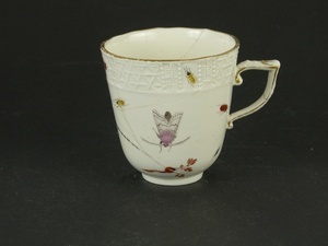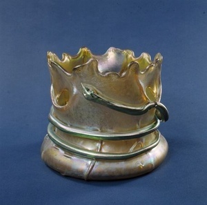 Bowlegefäß mit landwirtschaftlichen Motiven. Die Henkel sind in Form von Tierköpfen. Der eine ist ein Pferdekopf mit Zaumzeug, der andere in Form einer Kuh. Eine liegende Kuh ziert den Deckel. Den runden, bauchigen Gefäßkörper schmücken Weinlaub, Weinranken und Trauben. In der Mitte des Gefäßkörpers ist blau abgesetzt ein Zierschild. Dargestellt sind zwei landwirtschaftliche Geräte. Es könnte sich hierbei um einen Pflug und eine Egge handeln. Das restliche Gefäß ist in verschiedenen braun und cremetönen gehalten.