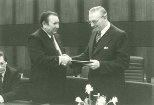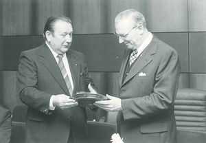 Schwarzweißfotografie. Dieses Foto, aufgenommen am 9. März 1979, zeigt den damaligen Bürgermeister der Stadt Bendorf Karl Schön beim Überreichen eines Eisengusstellers an den damaligen Staatsminister Hans-Jürgen Wischnewski im großen Sitzungssaal des Rathauses. Am 9. Oktober des selben Jahres endete die seit dem Jahr 1967 andauernde Amtszeit von Karl Schön und Dieter Trennheuser wurde zum neuen Bürgermeister der Stadt Bendorf gewählt.