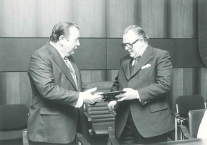 Schwarzweißfotografie. Dieses Foto, aufgenommen am 9. März 1979, zeigt den damaligen Staatsminister Hans-Jürgen Wischnewski beim Eintrag in das goldene Buch der Stadt Bendorf im großen Sitzungssaal des Rathauses. Links neben ihm sitzend Karl Schön, der damalige Bürgermeister der Stadt Bendorf. Am 9. Oktober des selben Jahres endete die seit dem Jahr 1967 andauernde Amtszeit von Karl Schön und Dieter Trennheuser wurde zum neuen Bürgermeister der Stadt Bendorf gewählt.