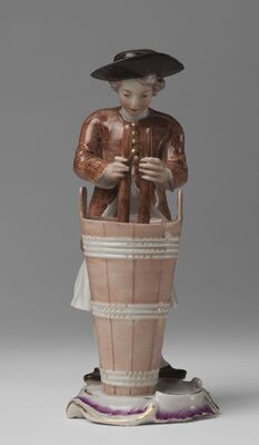 Der Winzer hat einen Logel vor sich stehen. Er ist gerade dabei, mit zwei Kolben darin zu stampfen. Er steht auf einem flachen Rocaillesockel, der mit Gold und Purpur verziert ist. Auf dem Kopf trägt er einen breitkrempigen schwarzen Hut. Gekleidet ist er in einen braunen Rock mit quadratischen Feldern, die regelmäßig abwechselnd horizontal und vertikal schraffiert sind. Vorne ist der Rock mit goldenen Knöpfen geschlossen. Darunter trägt er einen weißen Schurz. Nach einem Modell von Johann Friedrich Lück. Löwenmarke: JAH lig.