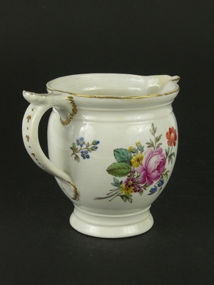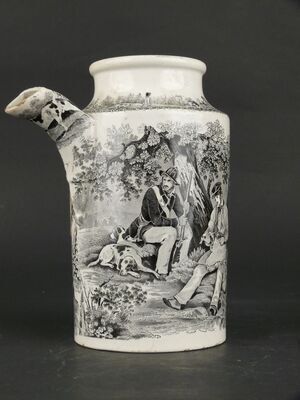 Die Milchkanne ist zylindrisch geformt. Oben ist sie humpenartig flach. Die Deckelscheibe mit Knopf sitzt nahezu waagerecht auf dem Gefäß. Den Ausguss bildet ein röhrender Hirschkopf. Das Geweih liegt als Relief auf der Kanne auf. Der Griff ist aus Hirschbein. Umrundet wird die Milchkanne von einer Vergissmeinnicht-Girlande. Der Deckel und dessen Auflage sind mit entsprechenden Kränzen aus Vergissmeinnicht geschmückt. Der Ausguss und Henkel sind purpur-braun.