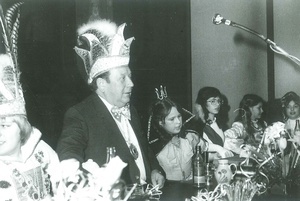 Schwarzweißfotografie. Diese Aufnahme zeigt den damaligen Bürgermeister der Stadt Bendorf Karl Schön während der Feierlichkeiten zum Karneval im Rathaus 1979. Er wird eingerahmt von einem Kinderprinzenpaar. Karl Schön war Bürgermeister der Stadt Bendorf von 1967 bis 1979.