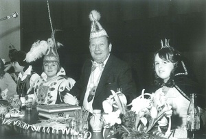 Schwarzweißfotografie. Diese Aufnahme zeigt den damaligen Bürgermeister der Stadt Bendorf Karl Schön während er im großen Sitzungssaal des Rathauses Mitglieder des Fußballvereines "TV 1895 Mülhofen e.V." und des englischen Gast-Vereins "Plenty Club" in Empfang nimmt. Hier überreicht er einen Bendorfer Wappenteller an seine Gäste. Karl Schön war Bürgermeister der Stadt Bendorf von 1967 bis 1979.