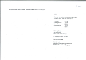 Notizbuch des ehemaligen Arbeiters der Concordiahütte Moritz Eifler. Das Heft enthält Eintragungen zu monatlichen bzw. jährlichen Einnahmen und Ausgaben sowie über seine Lebensumstände aus den Jahren 1910-1932: "1926 Bin Erwerbslos erhalte 21,60 die Woche und 5,00 vom Verband bis 8. März. Fahrrad verkauft Karl Herm und Werner für das Geld Schuhe gekauft Karl Anzug 24,50 Werner Anzug 35,00 Herm Anzug geschenkt bekommen Mai 27 Centner Kohlen erhalten 35,10 Juli 13,5 Brikett erhalten 15,60 Karl auf Hütte als Laufjunge pro Tag 1,00 Verdienst, bekommt 0,50 Sonntagsgeld Karl sehr schönes Zeugnis erhalten von der Schule"