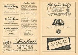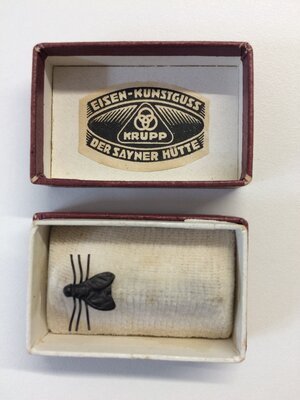 3 x Broschüre "2. u. 3. September 1950 / Mückenfest in Bendorf" / Festzelte im Sayner Schloßpark / veranstaltet vom / Verkehrs- und Verschönerungs-Verein / Bendorf-Sayn-Mülhofen e.V. Die „Sayner Mücke“ - eine gusseiserne Stubenfliege in Originalgröße - wurde wahrscheinlich Ende des 19. Jahrhunderts erstmals in der Sayner Hütte gegossen. Sie gilt als kleinstes Eisenkunstguss-Objekt der Sayner Hütte. Im September 1950 richtete der Verkehrs- und Verschönerungsverein Bendorf-Sayn-Mülhofen im Sayner Schlosspark das 1. Mückenfest aus. Dabei galt die Sayner Eisenkunstguss-Mücke als Festabzeichen: „... Vor (dem) Hintergrund einer mehr als drei Jahrhunderte zurückreichenden Erfahrung entwickelte der Bendorfer Kunstguß sein schwierigstes und künstlerisches Erzeugnis, die Mücke. … Dabei ist der Guß dieses winzigen Stückchens Eisen nicht einmal das schwierigste dabei. Schwieriger sind die Mückenbeine. Sie müssen einzeln aus dünnem Draht in den Formsand gestellt und später mit der Pinzette gebogen und gerichtet werden. Dabei hat sich schon manche kunstvoll erstellte Mücke ein Bein gebrochen. Dieser Kunstguß, den man in verschiedenen Museen als seltenes und auserlesenes Stück aufbewahrt, wird nun vom 2. bis 4. September 1950 als Anstecknadel zum ersten Male einem großen Volksfest am Fuße der Burg zu Sayn den Namen geben ...“ (Georg Schneider, „Mückenfest“, Festschrift 1950). Heute findet Anfang September in Sayn das sog. Burgen- und Parkfest, so zu sagen als Nachfolge für das "Mückenfest", statt.