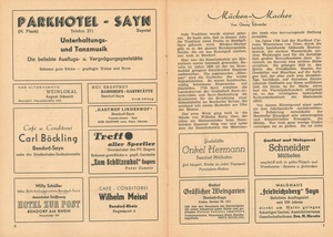 3 x Broschüre "2. u. 3. September 1950 / Mückenfest in Bendorf" / Festzelte im Sayner Schloßpark / veranstaltet vom / Verkehrs- und Verschönerungs-Verein / Bendorf-Sayn-Mülhofen e.V. Die „Sayner Mücke“ - eine gusseiserne Stubenfliege in Originalgröße - wurde wahrscheinlich Ende des 19. Jahrhunderts erstmals in der Sayner Hütte gegossen. Sie gilt als kleinstes Eisenkunstguss-Objekt der Sayner Hütte. Im September 1950 richtete der Verkehrs- und Verschönerungsverein Bendorf-Sayn-Mülhofen im Sayner Schlosspark das 1. Mückenfest aus. Dabei galt die Sayner Eisenkunstguss-Mücke als Festabzeichen: „... Vor (dem) Hintergrund einer mehr als drei Jahrhunderte zurückreichenden Erfahrung entwickelte der Bendorfer Kunstguß sein schwierigstes und künstlerisches Erzeugnis, die Mücke. … Dabei ist der Guß dieses winzigen Stückchens Eisen nicht einmal das schwierigste dabei. Schwieriger sind die Mückenbeine. Sie müssen einzeln aus dünnem Draht in den Formsand gestellt und später mit der Pinzette gebogen und gerichtet werden. Dabei hat sich schon manche kunstvoll erstellte Mücke ein Bein gebrochen. Dieser Kunstguß, den man in verschiedenen Museen als seltenes und auserlesenes Stück aufbewahrt, wird nun vom 2. bis 4. September 1950 als Anstecknadel zum ersten Male einem großen Volksfest am Fuße der Burg zu Sayn den Namen geben ...“ (Georg Schneider, „Mückenfest“, Festschrift 1950). Heute findet Anfang September in Sayn das sog. Burgen- und Parkfest, so zu sagen als Nachfolge für das "Mückenfest", statt.