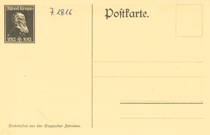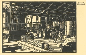 Schwarzweiß Holz(?)Druck als Postkarte gedruckt. Das Motiv der Postkarte zeigt das erste Martinswerk der Krupp'schen Gußstahlfabrik in Essen. Immer wieder verbesserte Alfred Krupp seine Herstellungsverfahren und meldete diverse Patente an. Im Jahr 1871 baute er ein Martinwerk mit den ersten in Deutschland eingesetzten Siemens-Martin-Öfen. Der "Siemens-Martin-Ofen" dient zur Reinigung von Roheisen mit dem Ziel der Gewinnung von Stahl und gehört zu den sogenannten Herdfrischverfahren. Der Begriff geht auf die Namen von Friedrich und Wilhelm Siemens sowie auf Pierre-Émile Martin und seinen Vater Émile Martin zurück.