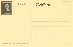 Schwarzweiß Holz(?)Druck als Postkarte gedruckt. Das Motiv der Postkarte zeigt den von Alfred Krupp entworfenen Dampfhammer "Fritz", der am 16. September 1861 als der damals größte Schmiedehammer der Welt in Betrieb genommen wurde. Er hatte eine Bärmasse von 50 Tonnen und ermöglichte das Ausschmieden besonders großer Werkstücke aus Gussstahl. Der Hammer blieb 50 Jahre lang in Betrieb. Dieses Bild aus dem Jahr 1911 zeigt die "letzte Schicht" dieses Monstrums kurz vor seinem Abbruch.