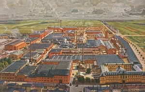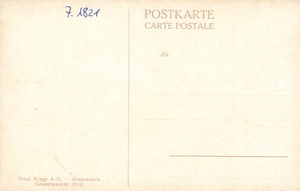 Kolorierte Zeichnung als Postkarte gedruckt. Das Motiv der Postkarte zeigt das Grusonwerk in der Gesamtansicht der Friedrich Krupp A.G. Gußstahlfabrik in Essen im Jahre 1912. Das erste Grusonwerk in Magdeburg-Buckau wurde im Jahre 1855 von Hermann Gruson gegründet. Es war später Teil der Friedrich Krupp AG und entwickelte sich zu einem der bedeutendsten Maschinenbau- und Rüstungsunternehmen Deutschlands. Alfred Krupp war der größte Waffenproduzent seiner Zeit, was ihm den Beinamen Kanonenkönig einbrachte. Seine verbesserten Artilleriegeschütze trugen zum deutschen Sieg im Deutsch-Französischen Krieg bei.