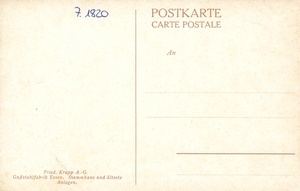Kolorierte Zeichnung als Postkarte gedruckt. Das Motiv der Postkarte zeigt in der Mitte das Stammhaus und die ersten Anlagen der Friedrich Krupp A.G. Gußstahlfabrik in Essen. Das erste Grusonwerk in Magdeburg-Buckau wurde im Jahre 1855 von Hermann Gruson gegründet. Es war später Teil der Friedrich Krupp AG und entwickelte sich zu einem der bedeutendsten Maschinenbau- und Rüstungsunternehmen Deutschlands. Alfred Krupp war der größte Waffenproduzent seiner Zeit, was ihm den Beinamen Kanonenkönig einbrachte. Seine verbesserten Artilleriegeschütze trugen zum deutschen Sieg im Deutsch-Französischen Krieg bei.