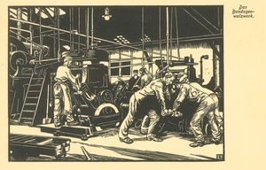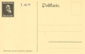 Schwarzweiß Holz(?)Druck als Postkarte gedruckt. Das Motiv der Postkarte zeigt das Bandagenwalzwerk der Friedrich Krupp A.G. Gußstahlfabrik in Essen. Um das Jahr 1850 entstand das erste Hammerwerk der Gussstahlfabrik. Bestandteil dieses Hammerwerks war auch ein Bandagenwalzwerk. Als Bandagen bezeichnete man die 1851 von Krupp entwickelten Radreifen ohne Schweißnaht. 1852/1853 gingen die nahtlosen Radreifen, für die Krupp seit 1853 das preußische Patent besaß, in Produktion: Ein geschmiedetes längliches Stück Stahl wurde mittig gespalten, ringförmig auseinandergetrieben, gereckt und gewalzt. Krupp verkaufte für Jahrzehnte seine Radreifen an die meisten nordamerikanischen Eisenbahnen und begründete damit den Erfolg des späteren Kruppschen Industrieimperiums. Die drei Ringe des Kruppschen Firmensymbols erinnern daran.