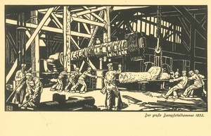Schwarzweiß Holz(?)Druck als Postkarte gedruckt. Das Motiv der Postkarte zeigt den großen Dampfstielhammer der Friedrich Krupp A.G. Gußstahlfabrik in Essen im Jahre 1852. Ihm folgte der von Krupp entworfene Dampfhammer "Fritz", der am 16. September 1861 als der damals größte Schmiedehammer der Welt in Betrieb genommen wurde.