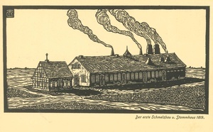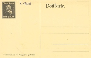 Schwarzweiß Holz(?)Druck als Postkarte gedruckt. Das Motiv der Postkarte zeigt die Friedrich Krupp A.G. Gußstahlfabrik in Essen im Jahre 1819. Links außen ist das Stammhaus erkennbar und daneben zu sehen ist der erste Schmelzbau. Gegründet im Jahr 1811 durch Friedrich Krupp, vergrößerte sie sich bis in das Jahr 1912 auf eine Fläche von bis zu fünf Quadratkilometern. Haupteinnahmequelle war die Rüstungsindustrie, was dem Werk zur Zeit des Nationalsozialismus den Beinamen "Waffenschmiede des Deutschen Reiches" einbrachte. Die Krupp'sche Gussstahlfabrik bildete die Keimzelle der zu einem Schwerindustrie-Unternehmen aufgestiegenen Friedrich Krupp AG, die heute in ThyssenKrupp als Deutschlands größtem Stahl- und Rüstungsunternehmen aufgegangen ist.