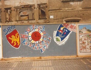 Schwarzweißfotografie. Diese Aufnahme zeigt das Siegel der Stadt Bendorf. Das Wappen fußt auf zwei Schöffensiegeln aus der zweiten Hälfte des 14. Jahrhunderts. Der herschauende, doppelschwänzige Löwe ist das Schildbild der Grafen von Sayn, die im Mittelalter Grund- und Gerichtsherren und seit Mitte des 14. Jahrhunderts auch Vögte des Bendorfer Hofes und der Abtei Maria Laach waren. Auf diese sollen zugleich die Symbole Stab, Mitra und Evangelienbuch des alten Pfarrpatrons St.Medard hindeuten. Das Wappen wurde 1946 wieder angenommen, nachdem seit 1939 als Stadtwappen nach der Vorlage von Hupp (1929) nur der Löwe von Sayn über einer Stadtmauer geführt worden war.