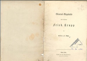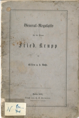 "General-Regulativ für die Firma Fried. Krupp in Essen a. d. Ruhr. Berlin 1872, Druck von H. S. Hermann.", 22-seitig. Der Einband der Broschüre besteht aus hellgrauem dünnen Karton. Der Text umfasst Grundsätze und Rechte für den Betrieb und die Verwaltung der Firma Krupp, ihrer Bergwerke und sonstigen Anlagen, Besitzungen und Geschäfte.
