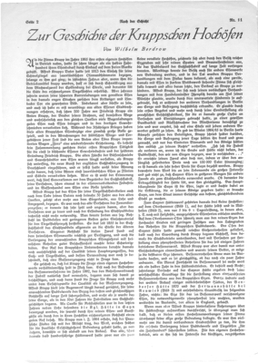 Zeitungsausgabe "Nach der Schicht (Kruppsche Mitteilungen)" Nr. 11, 9. Jahrgang, Mai 1929, Seite 2-7. Darin publiziert der Aufsatz von Wilhelm Berdrow "Zur Geschichte der Kruppschen Hochöfen" am Oberhammer, der Sayner Hütte, der Mülhofener Hütte und der Hermannshütte.