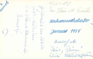 Schwarzweißfotografie als Postkarte gedruckt. Diese Aufnahme zeigt das ehemalige Haus "Prüm" in Bendorf (heutiges Stadiongebäude / Rheinstadion) während der Hochwasserkatastrophe im Januar des Jahres 1955.