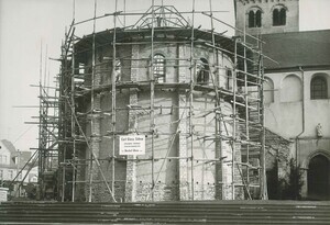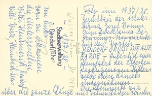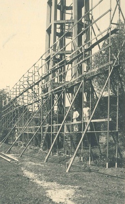 Schwarzweißfotografie als Postkarte gedruckt. Diese Aufnahme aus dem Jahr 1937/38 zeigt den von einem Gerüst umgebenen Wasserturm der Firma Dr. Otto im Bendorfer Rheinhafen. Anlässlich einer Rheinfahrt der ältesten Parteigenossen Adolf Hitlers wurde an diesem, von der Malerfirma Josef Bomm aufgestellten Gerüst ein Begrüßungstransparent mit der Aufschrift "BENDORF GRÜßT DIE ALTE GARDE" angebracht. Die gesamte Rheinwerft war zu diesem Anlass mit Fahnenstangen geschmückt. Auf dem Gerüst stehen die Malergesellen Willi Hemmerich aus Bendorf (links) und Willi Wirtz aus Heimbach-Weis.