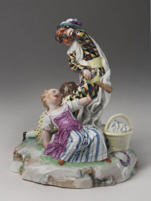 In der Mitte steht ein Knabe mit Maske vor dem Gesicht. Er ist in ein grün-blau-purpur kariertes Harlekin-Gewand gekleidet. Sein Mantel, den er darüber trägt, ist weiß mit einem Goldrand. Die Maske stellt ein rot-braunes Männergesicht mit schwarzen Haaren und Schnurrbart dar. Auf dem Kopf trägt er einen türkisfarbenen Hut mit einer weißen, grünen, roten und purpurnen Feder. In seiner rechten Hand hält er eine Art Knüppel. Mit der linken fasst er sich an den Kopf. Um ihn herum befinden sich ein kleiner kriechender Junge und ein am Boden sitzendes, sich rückwärts nach hinten beugendes, kleines Mädchen. Die Kleidung des Jungen ist blassgelb mit kurzen, schwarzen Strichen. Das Mädchen trägt einen blau-gestreiftem Rock mit einer purpurfarbenen, weißgetüpfelte Schürze. Marke CT, Ritzzeichen: 83. XOW.