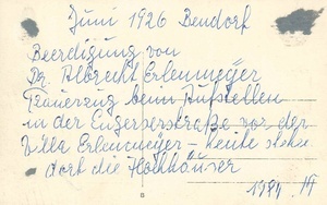 Schwarzweißfotografie als Postkarte gedruckt. Diese Aufnahme entstand im Juni des Jahres 1926 und zeigt den Trauerzug anlässlich der Beisetzung von Dr. Albrecht Erlenmeyer (1849-1926) vor der Villa Erlenmeyer in der Engerserstraße in Bendorf. Dr. Erlenmeyer leitete als Psychiater mehrere Heil- und Pflegeanstalten für psychisch Kranke in Bendorf (sog. Erlenmeyersche Heil- und Pflegeanstalten). Er ist Ehrenbürger der Stadt Bendorf. Ein Porträt in Öl gemalt hängt heute noch im Rathaus I der Stadt Bendorf.