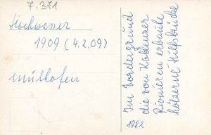 Schwarzweißfotografie als Postkarte gedruckt. Dieses Bild, aufgenommen am 4. Februar 1909, zeigt die Eisenbahnbrücke in Mülhofen während des Hochwassers im Jahre 1909. Im Vordergrund erkennbar ist die von Koblenzer Pionieren erbaute hölzerne Hilfsbrücke.