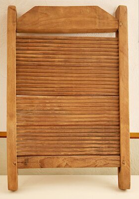 Selbstgebautes Skateboard oder Rollbrett aus Holz und einem Rollschuh, rot bemalt, weiß beschriftet. "Mitte der 1970er Jahre verbreitete sich der aus den USA kommende Freizeitsport des Skateboard-Fahrens in Deutschland - und in der Pfalz. Die Firma Mattel hatte in den USA bereits 1965 eine Barbie-Puppe namens "Scooter" herausgebracht, zu der ein rotes Rollbrett als Accessoir gehörte. Da es in Deutschland anfangs keine oder kaum Geschäfte gab, in denen man richtige "Rollbretter" kaufen konnte, wir Kinder in der Provinz aber unbedingt so eine Ding haben wollten, machte diese Not uns erfinderisch. Zusammen mit einem ebenfalls begeisterten Nachbarjungen, mit dem ich damals viel Zeit verbracht habe, bastelten wir aus den damals üblichen Rollschuhen, die man an die Schuhe anschnallte, unsere eigenen Rollbretter, indem wir Vorder- und Hinterteil eines solchen Rollschuhs aus Metall an einem länglichen Holzbrett festschraubten, das wir entsprechend zurechtsägten. Ich war damals etwa 11 bis 12 Jahre alt. Der Nachbarsjunge gab seinem Rollbrett eine sportlich-längliche Form mit langer Spitze vorne, das Holz lackierte er mit farblosem Bootslack. Ich nahm ein etwas kürzeres Brett, gab diesem rundlichere Formen, lackierte es rot und blau und beschriftete es stolz in kindlicher Schreibschrift mit dem weißen Schriftzug "Skateboard". Auf diese Weise hatten wir unsere eigenen Rollbretter, mit denen wir lange Zeit begeistert durch das Dorf fuhren. Die Gebrauchsspuren sind an meinem Rollbrett deutlich zu erkennen. Später kaufte ich dann bei Karstadt in Kaiserslautern ein "richtiges Skateboard" aus durchsichtigem Kunststoff - und mein gebasteltes Modell behielt ich als Erinnerungsstück. " (Notiz Vorbesitzer)