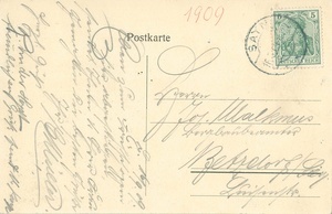 Schwarzweißfotografie als Postkarte gedruckt und am rechten unteren Bildrand mit der Aufschrift "Krupp'sches Logierhaus für Beamte in Sayn (Partie aus dem Garten)" versehen. Diese Aufnahme aus dem Jahr 1909 gewährt einen Blick in die Gartenanlagen des Krupp'schen Erholungsheimes in Sayn. Das aus Bruchstein errichtete Gebäude ließ Ferdinand Baron Bleul im Jahre 1839 als Maschinenfabrik und Gusswarenhandlung erbauen. Im Jahr 1872 verkaufte Ferdinand Bleul sein Unternehmen an die Firma Krupp, die zu dieser Zeit bereits Eigentümer der Sayner Hütte war. Anlässlich der Geburt ihres Sohnes Alfried stifteten Bertha und Gustav Krupp von Bohlen und Halbach den Angestellten der Krupp'schen Werke ein Erholungshaus in Sayn. Zu diesem Zweck wurden die Vordergebäude der ehemaligen von Bleul'schen Maschinenfabrik umgebaut und mit einer Terrasse versehen, die restlichen Fabrikgebäude wurden abgerissen und an deren Stelle eine Parkanlage angelegt. Bevor der Umbau begann musste ein Umzug der Maschinen in die neue, als Krupp'sche Halle bezeichnete Backsteinhalle auf dem Gelände der Sayner Hütte durchgeführt werden. Das Krupp'sche Erholungsheim für Werksbeamte wurde am 21. Mai 1909 eröffnet. Auf der linken Seite befand sich die Verkaufsstelle der Konsumanstalt, rechts wurde ein großer Speisesaal eingerichtet. 42 Einzelzimmer standen Erholungssuchenden zur Verfügung, dazu mehrere Aufenthaltsräume, ein Musikzimmer und die große Gartenanlage mit Wasserbecken, Springbrunnen und wasserspeiendem Eisbär. Während des Ersten und Zweiten Weltkrieges diente das Gebäude als Lazarett. 1952 verkaufte Krupp die Anlage an die Stadt Bendorf. Im Eingangsbereich des Gebäudes sieht man in dem Oberlicht über der Tür immer noch das Markenzeichen der Firma Krupp, die "Drei Ringe".