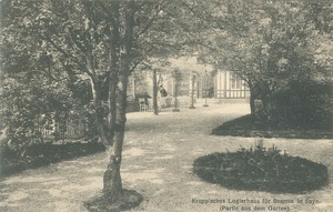 Schwarzweißfotografie als Postkarte gedruckt und am rechten unteren Bildrand mit der Aufschrift "Krupp'sches Logierhaus für Beamte in Sayn (Partie aus dem Garten)" versehen. Diese Aufnahme aus dem Jahr 1909 gewährt einen Blick in die Gartenanlagen des Krupp'schen Erholungsheimes in Sayn. Das aus Bruchstein errichtete Gebäude ließ Ferdinand Baron Bleul im Jahre 1839 als Maschinenfabrik und Gusswarenhandlung erbauen. Im Jahr 1872 verkaufte Ferdinand Bleul sein Unternehmen an die Firma Krupp, die zu dieser Zeit bereits Eigentümer der Sayner Hütte war. Anlässlich der Geburt ihres Sohnes Alfried stifteten Bertha und Gustav Krupp von Bohlen und Halbach den Angestellten der Krupp'schen Werke ein Erholungshaus in Sayn. Zu diesem Zweck wurden die Vordergebäude der ehemaligen von Bleul'schen Maschinenfabrik umgebaut und mit einer Terrasse versehen, die restlichen Fabrikgebäude wurden abgerissen und an deren Stelle eine Parkanlage angelegt. Bevor der Umbau begann musste ein Umzug der Maschinen in die neue, als Krupp'sche Halle bezeichnete Backsteinhalle auf dem Gelände der Sayner Hütte durchgeführt werden. Das Krupp'sche Erholungsheim für Werksbeamte wurde am 21. Mai 1909 eröffnet. Auf der linken Seite befand sich die Verkaufsstelle der Konsumanstalt, rechts wurde ein großer Speisesaal eingerichtet. 42 Einzelzimmer standen Erholungssuchenden zur Verfügung, dazu mehrere Aufenthaltsräume, ein Musikzimmer und die große Gartenanlage mit Wasserbecken, Springbrunnen und wasserspeiendem Eisbär. Während des Ersten und Zweiten Weltkrieges diente das Gebäude als Lazarett. 1952 verkaufte Krupp die Anlage an die Stadt Bendorf. Im Eingangsbereich des Gebäudes sieht man in dem Oberlicht über der Tür immer noch das Markenzeichen der Firma Krupp, die "Drei Ringe".