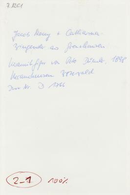 Schwarzweißfotografie. Diese Aufnahme zeigt eine Keramikskulptur, die Jakob Remy Arm in Arm mit seiner Ehefrau Catharina Remy, geb. Heymann (1556-1621) zeigt. Jakob Remy wurde im Jahr 1568 als Sohn von Jacques Remy (I. Generation Remy) und seiner Ehefrau Magdaléne in Lothringen geboren. Im Jahr 1595 heiratete er Catharina Heymann, die in erster Ehe mit Adolf Wingender verheiratet war und daher auch als Catharina Wingender bekannt war. Die beiden hatten 6 gemeinsame Kinder. Jakob Remy starb am 14. November 1628 in Höhr. Die abgebildete Keramikfigur im Stil des Historismus wurde von Franz Remy aus Bendorf in mehreren Exemplaren bei der Firma "Dümler und Breiten" in Auftrag gegeben. Es handelt sich um einen freien künstlerischen Entwurf, da es keinerlei bildliche Darstellungen des Ehepaares Remy gibt. Die Figur ist datiert aus dem Jahr 1898 und ist signiert von Peter Dümler. Die Skulptur gehört zum Bestand des Keramikmuseums in Höhr-Grenzhausen.