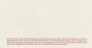 Nachdruck des Kupferstichs von A. Reinhardt aus dem Jahr 1748 mit Darstellung des Erzbergbaus auf der Vierwindenhöhe und der Remy'schen Hütte, der sog. Unteren Hütte, in Rheinnähe außerhalb der Stadt Bendorf. Dieser Stich zierte die Willkommensadresse für den Landesherren. In den Jahren 1723-1724 wird die Erlaubnis zum Eisenerzabbau auf der „Loh“ in Bendorf erteilt und die Grube „Vierwinden“ auf der heutigen Vierwindenhöhe öffnet ihren Betrieb. 1730-40 gehen alle Eisensteingruben in Bendorf in den Besitz von Wilhelm Remy über. Da aus der Ehe Wilhelms mit Maria Elisabeth Hoffmann (1711-1771) keine Kinder hervorgehen, nimmt er seinen Vetter und Schwager Johannes (1713-1778) als Teilhaber in sein Unternehmen auf. Die beiden führen das Familienunternehmen zum Erfolg, was sich auch im gesellschaftlichen Leben der Remys widerspiegelt: Sie bauen herrschaftliche Wohnhäuser und eine eigene Kirche für die reformierte Gemeinde. Die Familie lässt sich vom kurtrierischen Hofmaler Januarius Zick porträtieren. Der Landesherr ernennt Wilhelm Remy für seine Verdienste im Eisenhüttenwesen u. a. zum Kommerzienrat und beehrt ihn sogar mit einem Besuch. Anlässlich des Besuchs des Landesherrn Christian Friedrich Carl Alexander Markgraf zu Brandenburg, Herzog in Preußen und Graf zu Sayn und Wittgenstein, im Jahre 1748, entsteht der Kupferstich der „Willkommensadresse“ Wilhelm Remys, der anschaulich die Grube Vierwinde, das Stollenmundloch, den Steiger, die Bergleute bei der Arbeit, den Ort Bendorf mit der Medarduskirche sowie die Untere Remy´sche Hütte zeigt. Eingerahmt wird das Bild von Werkzeugen und Musikinstrumenten der Bergleute, außerdem sind das Wappen des Landesherren und die Initialen seines Namens zu erkennen. Wilhelm Remy beliefert bergische Stahlfabriken mit Roheisen, Handelshäuser in Rotterdam mit Kanonenkugeln. 1844 wird die Obere Hütte geschlossen und läutet damit langsam das Ende der Remy´schen Eisenverhüttung in Bendorf ein. „Nur diejenigen Werke, die auf Steinkohle bzw. Koks und Dampf umsteigen konnten, arbeiteten weiterhin rentabel."