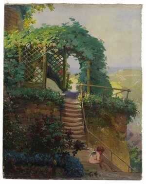Das Gemälde zeigt das Panorama von Bad Dürkheim mit einer Weinernte im Vordergrund. Es trägt den Untertitel „Bad Dürkheim «Grüngold - umrahmter Pfälzer Diamant »Wein - Wanderziel Deutschtreuer froher Zecher! K. Räder". Neben dem Lobgesang K. Räders, bildet auch die bildliche Darstellung die Stadt Bad Dürkheim und das umliegende Land und das Leben und Arbeiten dort in idyllischer Weise und mit werbender Absicht ab. Das Bild entstand wahrscheinlich von einer Anhöhe bei Ungstein aus mit Blick in Richtung Südwesten. Am linken Bildrand finden sich der Kurpark, rechts wird der Blick durch die heutige B 37 begrenzt. Das 1934 erbaute Wahrzeichen - das große Fass - fehlt noch. Signiert unten links: °Gustav Ernst 1928°. Das Werk steht beispielhaft für den Künstler, der 1858 in Elsterberg (Sachsen) geboren wurde und bis auf einige Jahre, sein gesamtes Leben in Bad Dürkheim verbrachte. Bad Dürkheim und die Pfalz und der dort stattfindende Weinbau sind die Hauptmotive seines Oeuvres, weshalb er als Pfälzer Winzer-Maler betitelt wird.