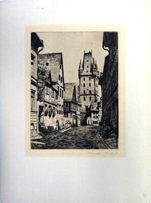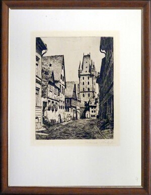Blick auf den Holzturm am Ende einer Mainzer Altstadtgasse mit dem Holztor im Hintergrund. An beiden Seiten der Gasse im Vordergrund typische Häuser des historischen Mainz. Auf dem Bürgersteig mehrere Bürgerinnen. Datierung 1922. Stammt aus der Mappe: Das goldene Mainz. Das Bild ist gerahmt.