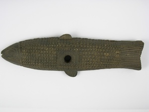 Die Meeresgöttin Thetis als Akt mit Perlschmuck begleitet von Fisch und Muschel. Farblich ist die Plastik sehr blass gehalten. Thetis Hüfte ist mit einem weißen, faltenreichen Tuch bedeckt, der Oberkörper ist unbekleidet. In der rechten Hand hält sie einen Handspiegel. Ihr Haupt ziert ein tiefblaues Diadem mit Goldrand. Um ihren Hinterkopf ist ein Perlenband geschlungen. Thetis sitzt auf einem Fisch, der sich wiederum in einer großen Muschel befindet. Der Fisch ist in blassen grün und Grautönen gehalten. Er hat ein rotes Maul und rote Flossen. Die Muschel ist innen weiß mit blassvioletten Flecken. Der Sockel und die Muschelunterseite ist bräunlich. Ein Modell von Adam Bauer. Blaumarke: CT mit Kurhut, 80.