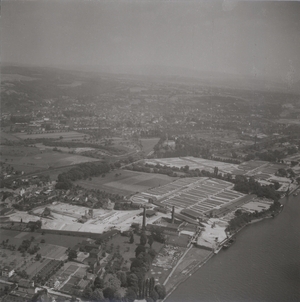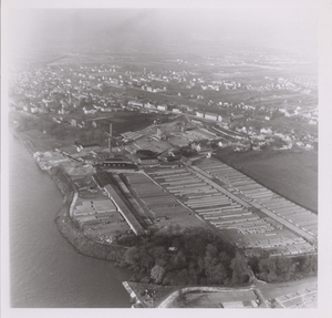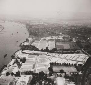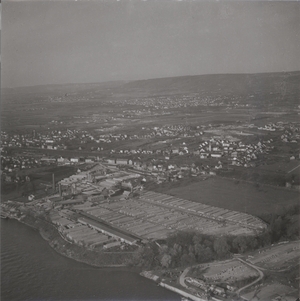 Schwarzweißfotografie. Diese Luftaufnahme aus dem Jahr 1961 zeigt den seit 1899/1900 bestehenden Bendorfer Rheinhafen mit seinen für die damalige Zeit charakteristischen Schwemmsteinbetrieben. In der Bildmitte ist das Gelände der ehemaligen Mülhofener Hütte mit noch erhaltenen Schornsteinen zu erkennen. Hier wurde nach Schließung der Mülhofener Hütte die "Schemmsteinfabrik Frankfurt a. M. GmbH" 1927 gegründet, aus der die heutige Firma Kann hervorgegangen ist. Aufgrund des reichen Bimsvorkommens entstanden seit dem 19. Jahrhundert im Koblenz-Neuwieder Becken unzählige Schwemmsteinfabriken, die aus Bims und Kalk Bimssteine produzierten. Durch die Ansiedlung der Mittelrheinischen Tanklager Gesellschaft in den 1970er Jahren erfolgte eine Umstrukturierung des Hafens. Ab 2010 wurde dann eine weitere Modernisierung des Hafens durchgeführt. Am 24.8.2012 erfolgte die Einweihung des neuen Hafens.
