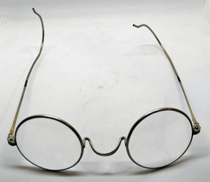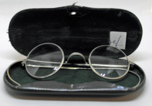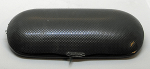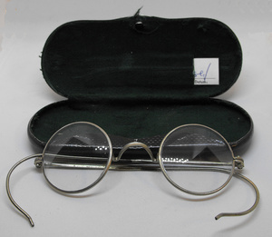 Aufklappbares Blechgehäuse in Farbe Oliv, innen mit grünem samtartigen Stoff beschichtet und mit Brille zum Tragen unter einer ABC Schutzmaske. Anstelle des üblichen Schlaufen aus elastischem Material sind Metallbügel mit elastische Ohrhaltern montiert. Die Gläser sind rund und in einer Metallfassung fest montiert. Im Deckel des Etui ist ein Zettel eingeschoben mit Name und Einheit des Trägers und auf der Rückseite die Stärke der Brillengläser notiert. Brillenbreite 110 mm, Gläserdurchmesser 377 mm