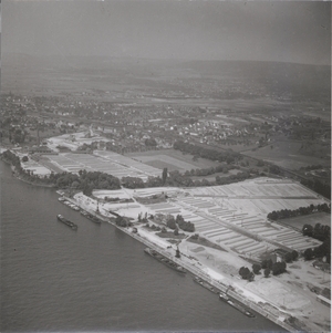 Schwarzweißfotografie. Diese Luftaufnahme aus dem Jahr 1961 zeigt den seit 1899/1900 bestehenden Bendorfer Rheinhafen mit seinen für die damalige Zeit charakteristischen Schwemmsteinbetrieben. Am linken Bildrand ist das Gelände der ehemaligen Mülhofener Hütte mit noch erhaltenen Schornsteinen zu erkennen. Hier wurde nach Schließung der Mülhofener Hütte die "Schemmsteinfabrik Frankfurt a. M. GmbH" 1927 gegründet, aus der die heutige Firma Kann hervorgegangen ist. Aufgrund des reichen Bimsvorkommens entstanden seit dem 19. Jahrhundert im Koblenz-Neuwieder Becken unzählige Schwemmsteinfabriken, die aus Bims und Kalk Bimssteine produzierten. Im Hintergrund erkennbar sind die Städte Mülhofen und Engers. Durch die Ansiedlung der Mittelrheinischen Tanklager Gesellschaft in den 1970er Jahren erfolgte eine Umstrukturierung des Hafens. Ab 2010 wurde dann eine weitere Modernisierung des Hafens durchgeführt. Am 24.8.2012 erfolgte die Einweihung des neuen Hafens.