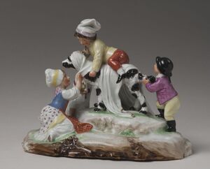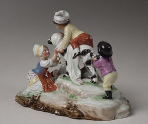 Auf einem gestuften Erd-Rasen-Sockel steht ein schwarz-weiss gezeichneter Hund, der von einem knienden, farbig reich staffierten Mädchen mit einer weißen Decke drapiert wird. Ein Junge mit gelbem Wams und roten Hosen besteigt den Hund wie ein Reittier. Ein kleiner Bub, in violett-gelb, packt ihn am Schwanz. Ein kleines Mädchen in weißem, langen Hemd spielt daneben. Blaumarke CT und drei Punkte Ritzzeichen CF 3