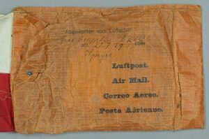 Der Zeppelinpost-Abwurfbeutel besteht aus einem Couvert in den Maßen 14 cm x 21,5 cm, an dem ein langes Band von ca. 2 Metern angeschlossen ist. Das Couvert ist aus Papier und beinhaltete mehrere Poststücke. Häufig handelte es sich bei diesen Poststücken um Sammlerpost, aber auch reguläre Poststücke wurden so versandt. Auf dem Couvert ist vermerkt, dass die Luftschiffpost am 28.07.1929 vom Luftschiff "Graf Zeppelin L.Z.127" über Speyer abgeworfen wurde. Das Band besteht zum Großteil aus einem zusammengenähten Stoff in den Signalfarben rot-weiß. So konnte der wachsartige Beutel aus Ölpapier zuverlässiger gefunden werden. Das Band schließt mit einem zusammengenähten Stoffband in den Farben des Deutschen Reiches mit aufgesetztem goldenen Posthorn, dem Symbol der Post im Allgemeinen. / "Am 28. Juli 1929 fand die 26. Fahrt des erst im Vorjahr in Dienst gestellten Luftschiffs LZ 127 Graf Zeppelin statt. Die Fahrt führte von Friedrichshafen (Aufstieg 07:30 Uhr) über Stuttgart - Pforzheim - Koblenz - Trier - Traben-Tranbach - Speyer - Kaiserslautern - Durmersheim - Landau i.d.Pf. - Bad Dürkheim - Wachenheim - Pirmasens - Freudenstadt - Bad Dürrheim und Eichsberg (St. Gallen) zurück nach Friedrichshafen (Landung 19:17 Uhr) bei einer Fahrtstrecke von 1108 km und einer Fahrtdauer von 11:47 Stunden. Über den geannten Orten wurde jeweils Post abgeworfen. Die Fahrt wurde als "Fahrt in das besetzte Rheinland" bekannt." [Moritz-Adolf Trappe]. / (Das HMP Speyer bedankt sich sehr herzlich für ergänzende und korrigierende Hinweise bei Herrn Moritz-Adolf Trappe vom Verein Zeppelinstadt Werdohl e.V.)