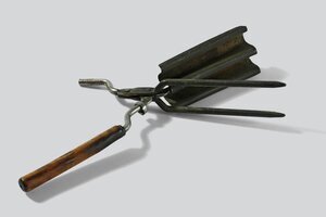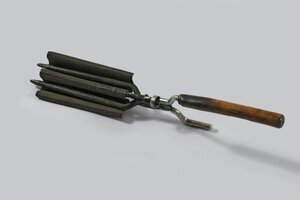 Scherenartiges Volleisen mit Holzgriff zum Herstellen von zwei Dauerwellen. Die Scherenarm ist rund und der zweite Scherenarm aus einer geformten Blechplatte als Halbschale ausgebildet, so dass die runden Scherenarme in die die Halbschalen sich einfügen. Ein Holzgriff fehlt. Bei der Verwendung wurde das Onduliereisen im Ofen erwärmt und eine Haarsträhne zwischen die beiden Scherenteile gepresst. So konnten in den 1920er bis 1960er Jahre doppelte Dauerwellen hergestellt werden.