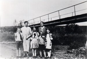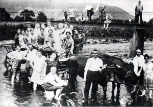 Das Foto zeig Kurgästen, die aus dem Dorf über die Ahr in die Kureinrichtung unterwegs sind. Teilweise stehen oder sitzen sie in der Ahr oder stehen auf dem Anhängen mit Ochsengespann. Dritter v. l. ein Sohn von Josef Hardt (näheres nicht bekannt). Gleich hinter den Ochsenkarren ist der "Eiserne Steg" über die Ahr mit Erwachsenen und Kindern darauf zu sehen. Im Hintergrund auf der Linken Seite sind Weinberge, auf dem Reisberg, zu erkennen.