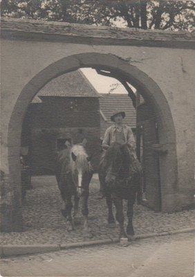 Der Landwirt Alfons Giesen reitet auf Pferd aus dem Hof und führt am Zügel ein zweites Pferd. Her Hof ist Teil des früheren zur Reichsherrlichkeit Landskron gehörenden Zehnthofs.